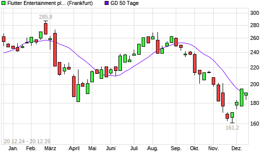 Mit dem Anstieg auf 190,75 EUR hat die Flutter Entertainment-Aktie am 19.12.2025 die 50-Tage-Linie nach oben gekreuzt.