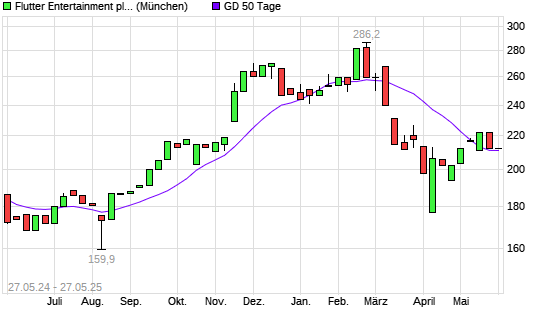 Mit dem Anstieg auf 213,20 EUR hat die Flutter Entertainment-Aktie am 26.05.2025 die 50-Tage-Linie nach oben gekreuzt.Die Flutter Entertainment-Aktie befindet sich seit dem 28.03.2025 im langfristigen ...weiterlesen