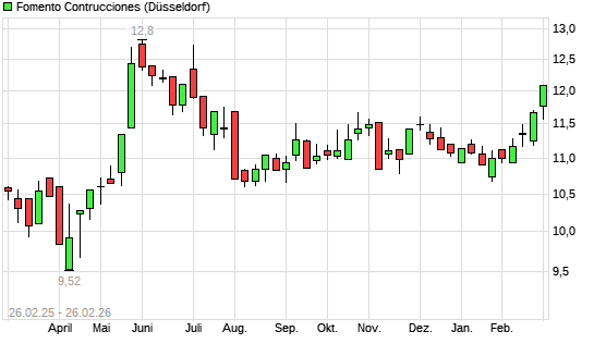 Mit dem Anstieg auf 11,98 EUR hat die Fomento Construcciones-Aktie (ISIN ES0122060314) am 25.02.2026 ein neues 6-Monats-Hoch erreicht und damit den Kurs vom 23.02.2026 eingestellt.