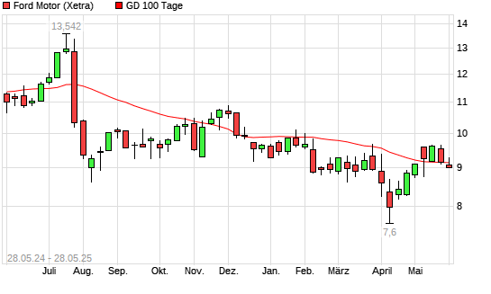 Mit dem Rücksetzer auf 8,98 EUR hat die Ford Motor-Aktie am 27.05.2025 die 100-Tage-Linie nach unten gekreuzt.