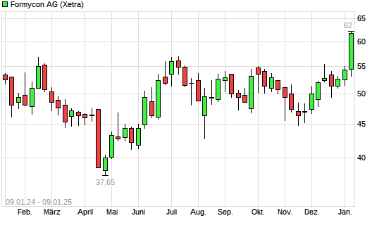 Mit dem Anstieg auf 60,90 EUR hat die Formycon-Aktie (ISIN DE000A1EWVY8) am 08.01.2025 ein neues 12-Monats-Hoch erreicht und damit den Kurs vom 07.01.2025 eingestellt.