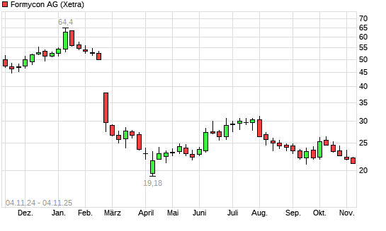 Mit dem Rücksetzer auf 21,30 EUR hat die Formycon-Aktie (ISIN DE000A1EWVY8) am 03.11.2025 ein neues 6-Monats-Tief erreicht und damit den Kurs vom 16.09.2025 eingestellt.