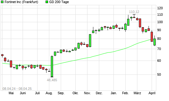 Mit dem Anstieg auf 81,39 EUR hat die Fortinet-Aktie am 07.04.2025 die 200-Tage-Linie nach oben gekreuzt.