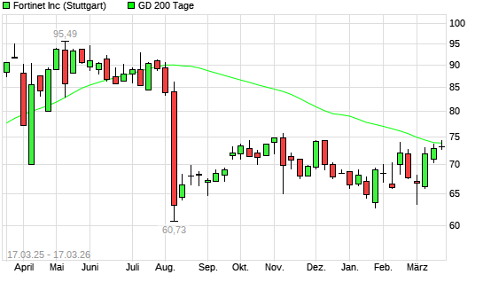 Mit dem Anstieg auf 73,90 EUR hat die Fortinet-Aktie am 16.03.2026 die 200-Tage-Linie nach oben gekreuzt.