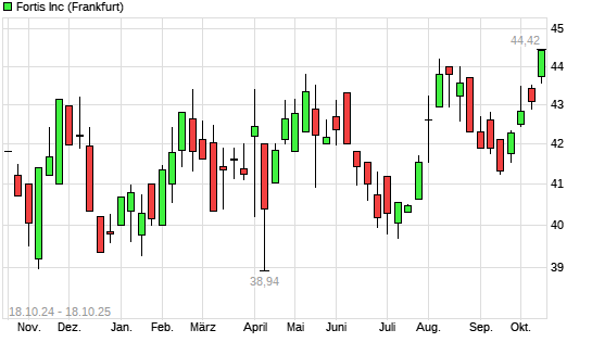 Mit dem Anstieg auf 44,42 EUR hat die Fortis-Aktie (ISIN CA3495531079) am 17.10.2025 ein neues 3-Jahres-Hoch erreicht und damit den Kurs vom 16.10.2025 eingestellt.