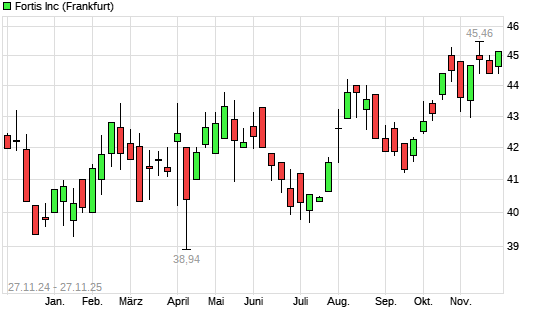 Mit dem Anstieg auf 45,14 EUR hat die Fortis-Aktie (ISIN CA3495531079) am 26.11.2025 ein neues 3-Jahres-Hoch erreicht und damit den Kurs vom 13.11.2025 eingestellt.