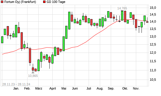 Mit dem Rücksetzer auf 14,07 EUR hat die Fortum-Aktie am 27.11.2024 die 100-Tage-Linie nach unten gekreuzt.