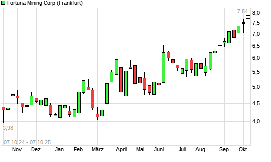 Mit dem Anstieg auf 7,80 EUR hat die Fortuna Silver Mines-Aktie (ISIN CA3499421020) am 06.10.2025 ein neues 5-Jahres-Hoch erreicht und damit den Kurs vom 05.01.2021 eingestellt.