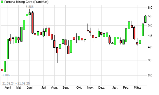 Mit dem Anstieg auf 5,55 EUR hat die Fortuna Silver Mines-Aktie (ISIN CA3499421020) am 20.03.2025 ein neues 6-Monats-Hoch erreicht und damit den Kurs vom 19.03.2025 eingestellt.
