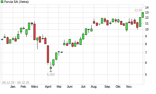 Mit dem Anstieg auf 12,77 EUR hat die Forvia-Aktie (ISIN FR0000121147) am 05.12.2025 ein neues 12-Monats-Hoch erreicht und damit den Kurs vom 04.12.2025 eingestellt.