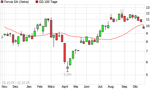 Mit dem Rücksetzer auf 10,07 EUR hat die Forvia-Aktie am 20.10.2025 die 100-Tage-Linie nach unten gekreuzt.