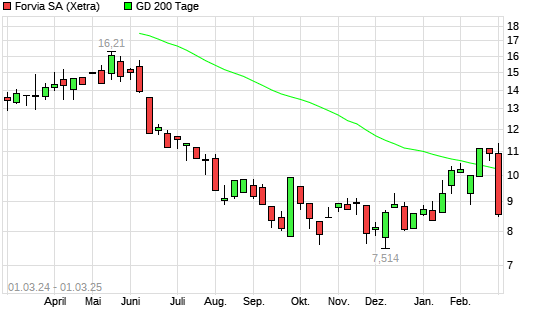 Mit dem Rücksetzer auf 8,59 EUR hat die Forvia-Aktie am 28.02.2025 die 200-Tage-Linie nach unten gekreuzt.