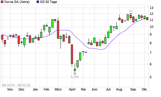 Mit dem Rücksetzer auf 10,87 EUR hat die Forvia-Aktie am 07.10.2025 die 50-Tage-Linie nach unten gekreuzt.