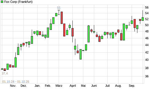 Mit dem Anstieg auf 53,50 EUR hat die Fox Corporation-Aktie (ISIN US35137L1052) am 30.09.2025 ein neues 6-Monats-Hoch erreicht und damit den Kurs vom 08.09.2025 eingestellt.