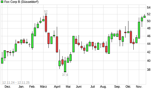 Mit dem Anstieg auf 51,50 EUR hat die Fox Corporation-Aktie (ISIN US35137L2043) am 11.11.2025 ein neues 6-Monats-Hoch erreicht und damit den Kurs vom 07.11.2025 eingestellt.