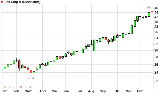 Mit dem Anstieg auf 44,60 EUR hat die Fox Corporation-Aktie (ISIN US35137L2043) am 27.12.2024 ein neues All-Time-High erreicht und damit den Kurs vom 26.12.2024 eingestellt.