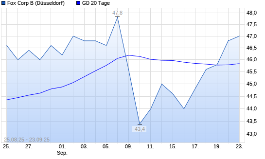 Mit dem Anstieg auf 47,20 EUR hat die Fox Corporation-Aktie am 22.09.2025 die 20-Tage-Linie nach oben gekreuzt.