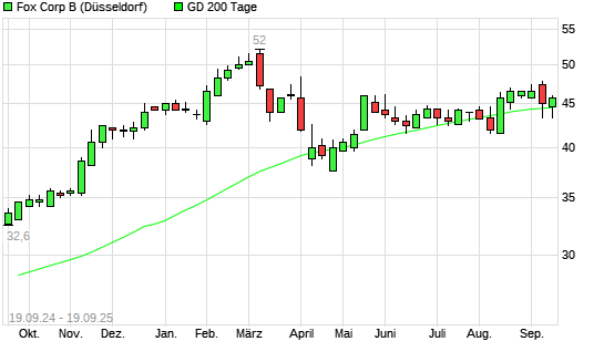 Mit dem Anstieg auf 45,20 EUR hat die Fox Corporation-Aktie am 18.09.2025 die 200-Tage-Linie nach oben gekreuzt.