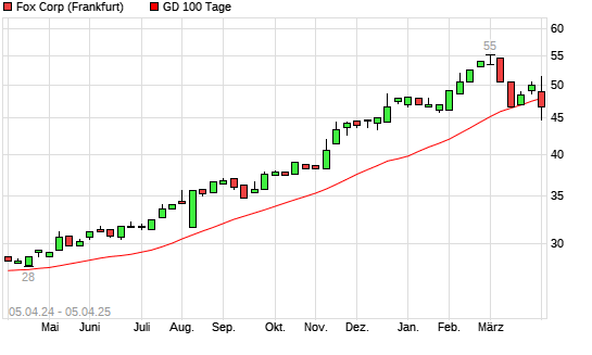 Mit dem Rücksetzer auf 46,40 EUR hat die Fox Corporation-Aktie am 04.04.2025 die 100-Tage-Linie nach unten gekreuzt.