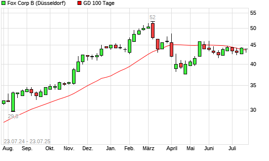 Mit dem Rücksetzer auf 43,20 EUR hat die Fox Corporation-Aktie am 22.07.2025 die 100-Tage-Linie nach unten gekreuzt.