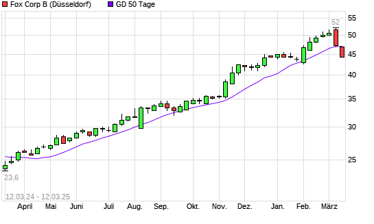 Mit dem Rücksetzer auf 45,60 EUR hat die Fox Corporation-Aktie am 11.03.2025 die 50-Tage-Linie nach unten gekreuzt.