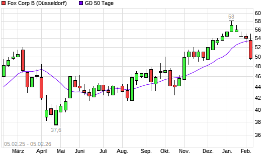 Mit dem Rücksetzer auf 53,00 EUR hat die Fox Corporation-Aktie am 04.02.2026 die 50-Tage-Linie nach unten gekreuzt.
