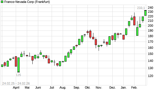 Mit dem Anstieg auf 227,00 EUR hat die Franco-Nevada-Aktie (ISIN CA3518581051) am 23.02.2026 ein neues All-Time-High erreicht und damit den Kurs vom 28.01.2026 eingestellt.