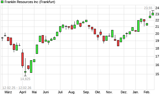 Mit dem Anstieg auf 23,55 EUR hat die Franklin Resources-Aktie (ISIN US3546131018) am 11.02.2026 ein neues 12-Monats-Hoch erreicht und damit den Kurs vom 05.02.2026 eingestellt.