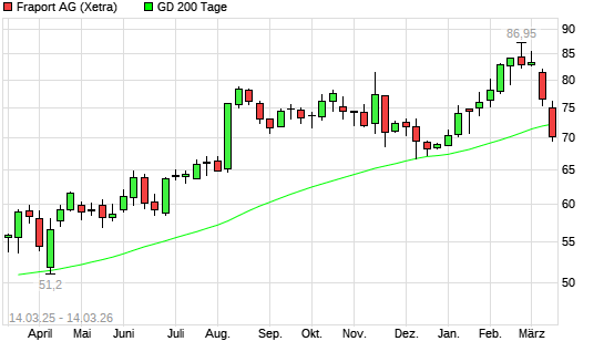 Mit dem Rücksetzer auf 71,80 EUR hat die Fraport-Aktie am 13.03.2026 die 200-Tage-Linie nach unten gekreuzt.