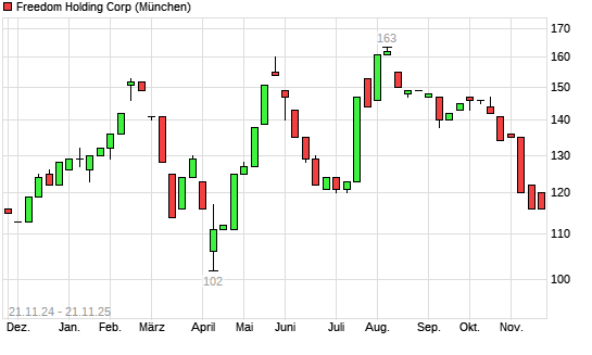 Mit dem Rücksetzer auf 115,00 EUR hat die Freedom Holding-Aktie (ISIN US3563901046) am 20.11.2025 ein neues 6-Monats-Tief erreicht und damit den Kurs vom 17.11.2025 eingestellt.