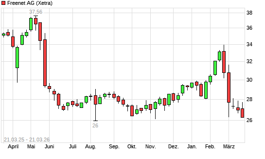 Mit dem Rücksetzer auf 26,32 EUR hat die Freenet-Aktie (ISIN DE000A0Z2ZZ5) am 20.03.2026 ein neues 12-Monats-Tief erreicht und damit den Kurs vom 05.11.2025 eingestellt.