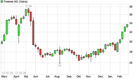 Mit dem Anstieg auf 33,50 EUR hat die Freenet-Aktie (ISIN DE000A0Z2ZZ5) am 16.02.2026 ein neues 6-Monats-Hoch erreicht und damit den Kurs vom 12.02.2026 eingestellt.