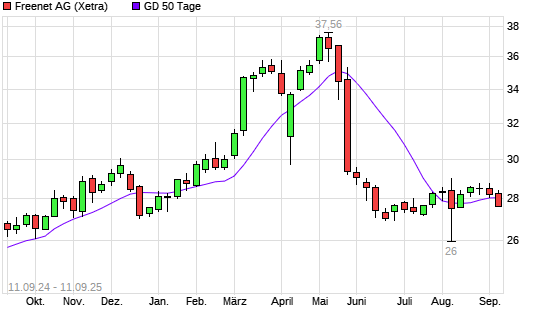 Mit dem Rücksetzer auf 27,78 EUR hat die Freenet-Aktie am 10.09.2025 die 50-Tage-Linie nach unten gekreuzt.