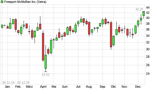 Mit dem Anstieg auf 42,04 EUR hat die Freeport-McMoran Copper-Aktie (ISIN US35671D8570) am 19.12.2025 ein neues 12-Monats-Hoch erreicht und damit den Kurs vom 12.12.2025 eingestellt.