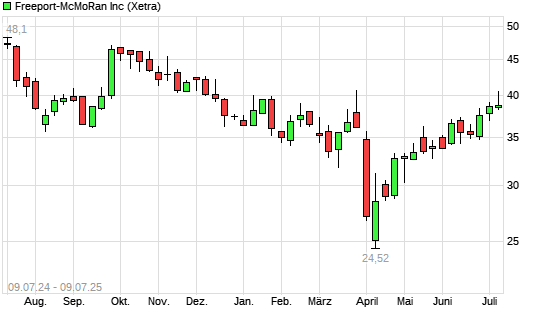 Mit dem Anstieg auf 40,07 EUR hat die Freeport-McMoran Copper-Aktie (ISIN US35671D8570) am 08.07.2025 ein neues 6-Monats-Hoch erreicht und damit den Kurs vom 20.01.2025 eingestellt.