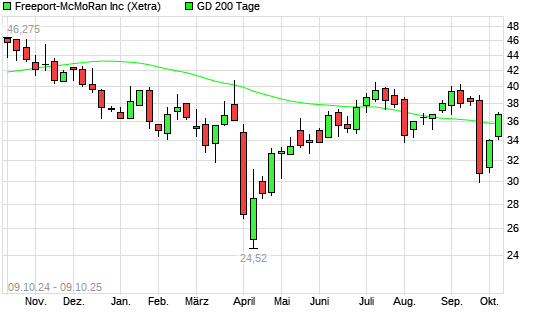 Mit dem Anstieg auf 36,93 EUR hat die Freeport-McMoran Copper-Aktie am 08.10.2025 die 200-Tage-Linie nach oben gekreuzt.