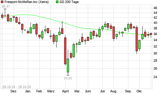 Mit dem Rücksetzer auf 35,21 EUR hat die Freeport-McMoran Copper-Aktie am 27.10.2025 die 200-Tage-Linie nach unten gekreuzt.