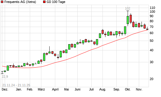 Mit dem Rücksetzer auf 63,20 EUR hat die Frequentis-Aktie am 20.11.2025 die 100-Tage-Linie nach unten gekreuzt.