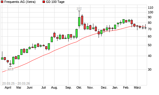 Mit dem Rücksetzer auf 71,20 EUR hat die Frequentis-Aktie am 19.03.2026 die 100-Tage-Linie nach unten gekreuzt.