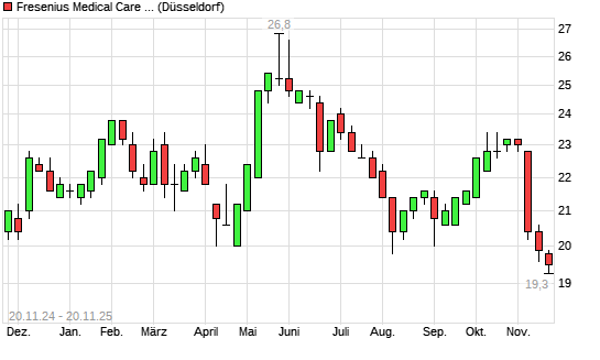 Mit dem Rücksetzer auf 19,50 EUR hat die Fresenius Medical Care ADR-Aktie (ISIN US3580291066) am 19.11.2025 ein neues 12-Monats-Tief erreicht und damit den Kurs vom 18.11.2025 eingestellt.