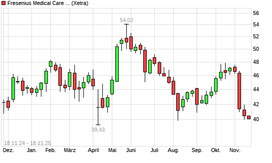 Mit dem Rücksetzer auf 40,00 EUR hat die Fresenius Medical Care-Aktie (ISIN DE0005785802) am 17.11.2025 ein neues 12-Monats-Tief erreicht und damit den Kurs vom 14.11.2025 eingestellt.