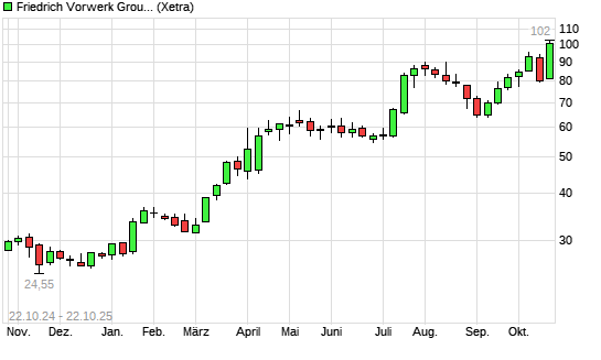 Mit dem Anstieg auf 100,00 EUR hat die Friedrich Vorwerk Group-Aktie (ISIN DE000A255F11) am 21.10.2025 ein neues All-Time-High erreicht und damit den Kurs vom 09.10.2025 eingestellt.