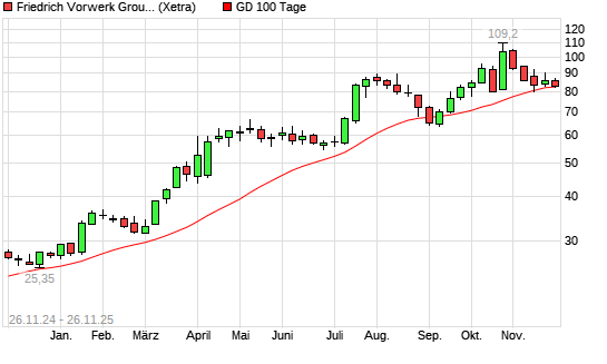 Mit dem Rücksetzer auf 82,20 EUR hat die Friedrich Vorwerk Group-Aktie am 25.11.2025 die 100-Tage-Linie nach unten gekreuzt.