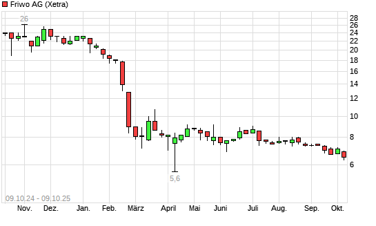 Mit dem Rücksetzer auf 6,05 EUR hat die Friwo-Aktie (ISIN DE0006201106) am 08.10.2025 ein neues 10-Jahres-Tief erreicht und damit den Kurs vom 29.09.2025 eingestellt.