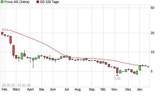 Mit dem Rücksetzer auf 5,70 EUR hat die Friwo-Aktie am 20.01.2026 die 100-Tage-Linie nach unten gekreuzt.