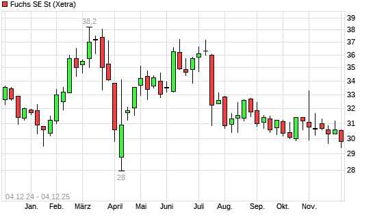 Mit dem Rücksetzer auf 29,55 EUR hat die Fuchs SE-Aktie (ISIN DE000A3E5D56) am 03.12.2025 ein neues 6-Monats-Tief erreicht und damit den Kurs vom 02.12.2025 eingestellt.