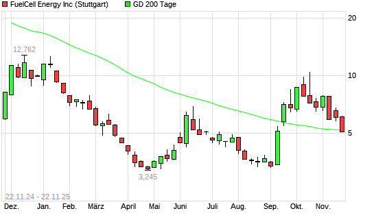 Mit dem Rücksetzer auf 5,10 EUR hat die FuelCell Energy-Aktie am 21.11.2025 die 200-Tage-Linie nach unten gekreuzt.