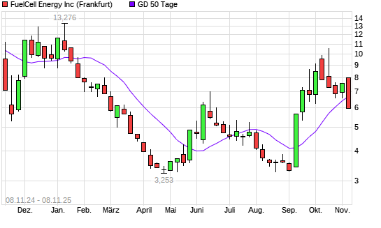 Mit dem Rücksetzer auf 5,98 EUR hat die FuelCell Energy-Aktie am 07.11.2025 die 50-Tage-Linie nach unten gekreuzt.