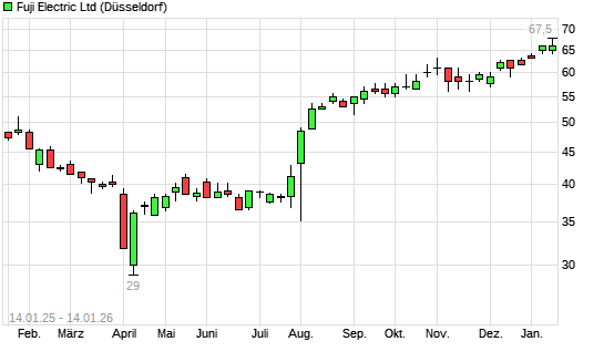 Mit dem Anstieg auf 67,00 EUR hat die Fuji Electric-Aktie (ISIN JP3820000002) am 13.01.2026 ein neues All-Time-High erreicht und damit den Kurs vom 12.01.2026 eingestellt.