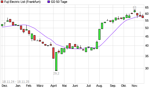 Mit dem Anstieg auf 59,50 EUR hat die Fuji Electric-Aktie am 17.11.2025 die 50-Tage-Linie nach oben gekreuzt.